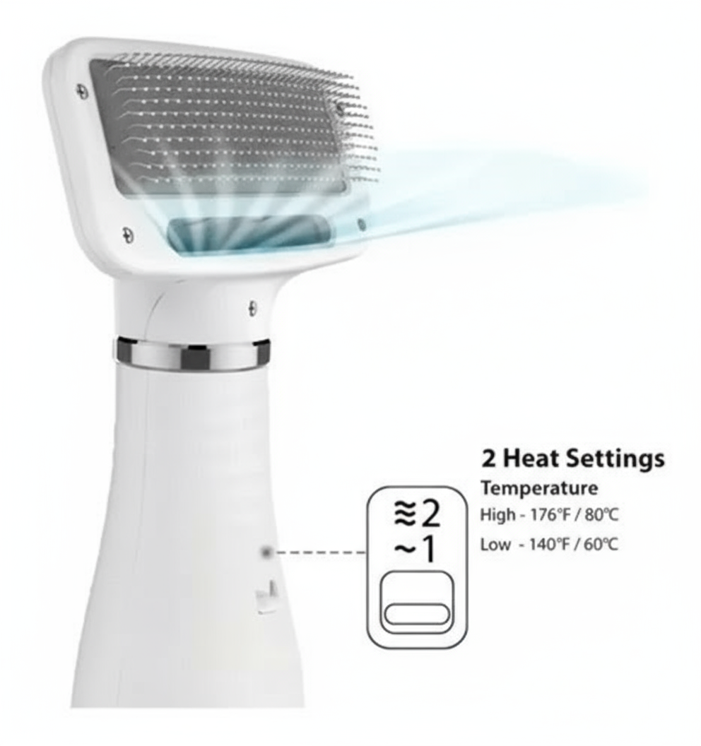El secador y peine para mascotas 2 en 1 combina ambas funciones en un solo dispositivo, permitiéndote secar y peinar a tus mascotas de manera rápida y sencilla. Es ideal para eliminar enredos, pelo muerto y nudos, logrando un acabado suave, brillante y limpio en minutos.